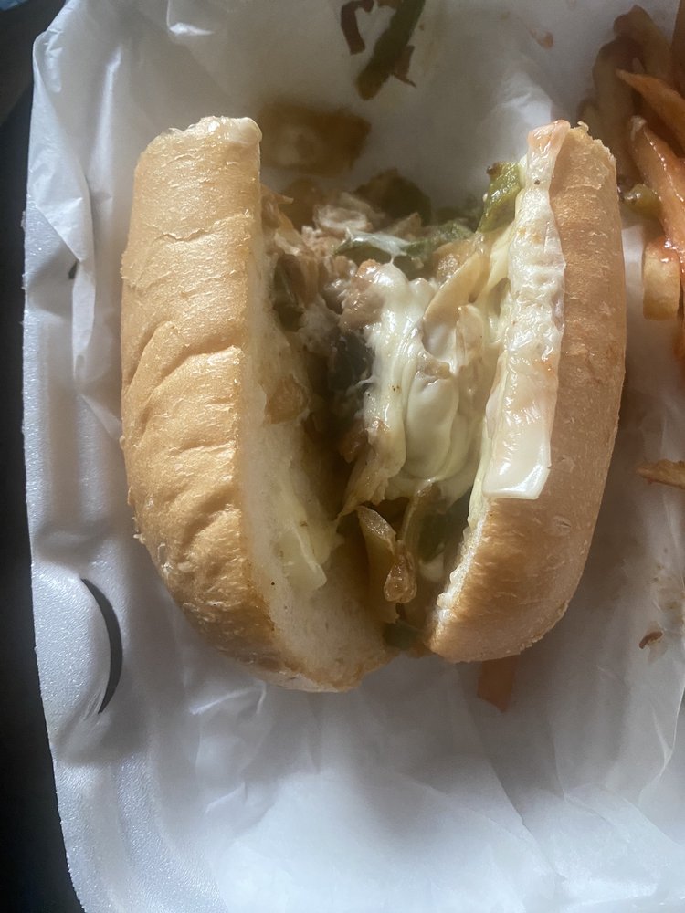 Onions, green peppers, cheese, mayo, and mushroom. Served with fries.